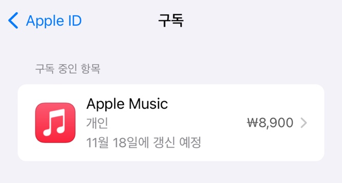 2. 구독 중인 항목에서 'Apple Music'을 클릭하여서 '구독 취소'를 하면 완료됩니다.