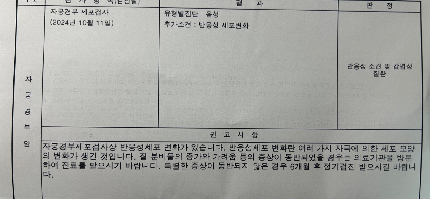 이후에 우편물로도 날아온 검사결과에는 반응성 세포 변화라는 추가소견을 받을 수 있었습니다.