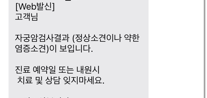 자궁 경부암 검사를 10월 11일 진행하였고 결과는 10월 15일 문자로 받을 수 있었습니다.