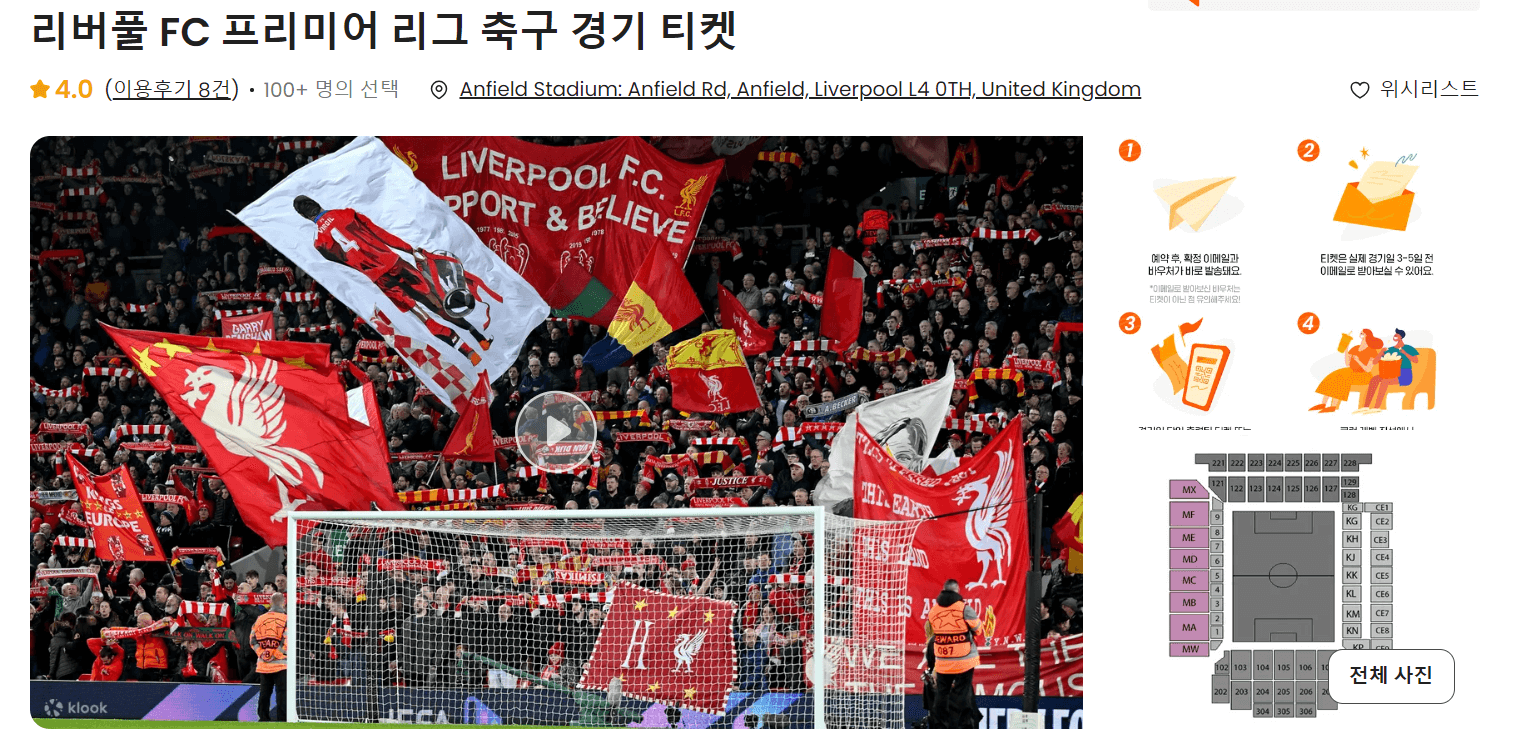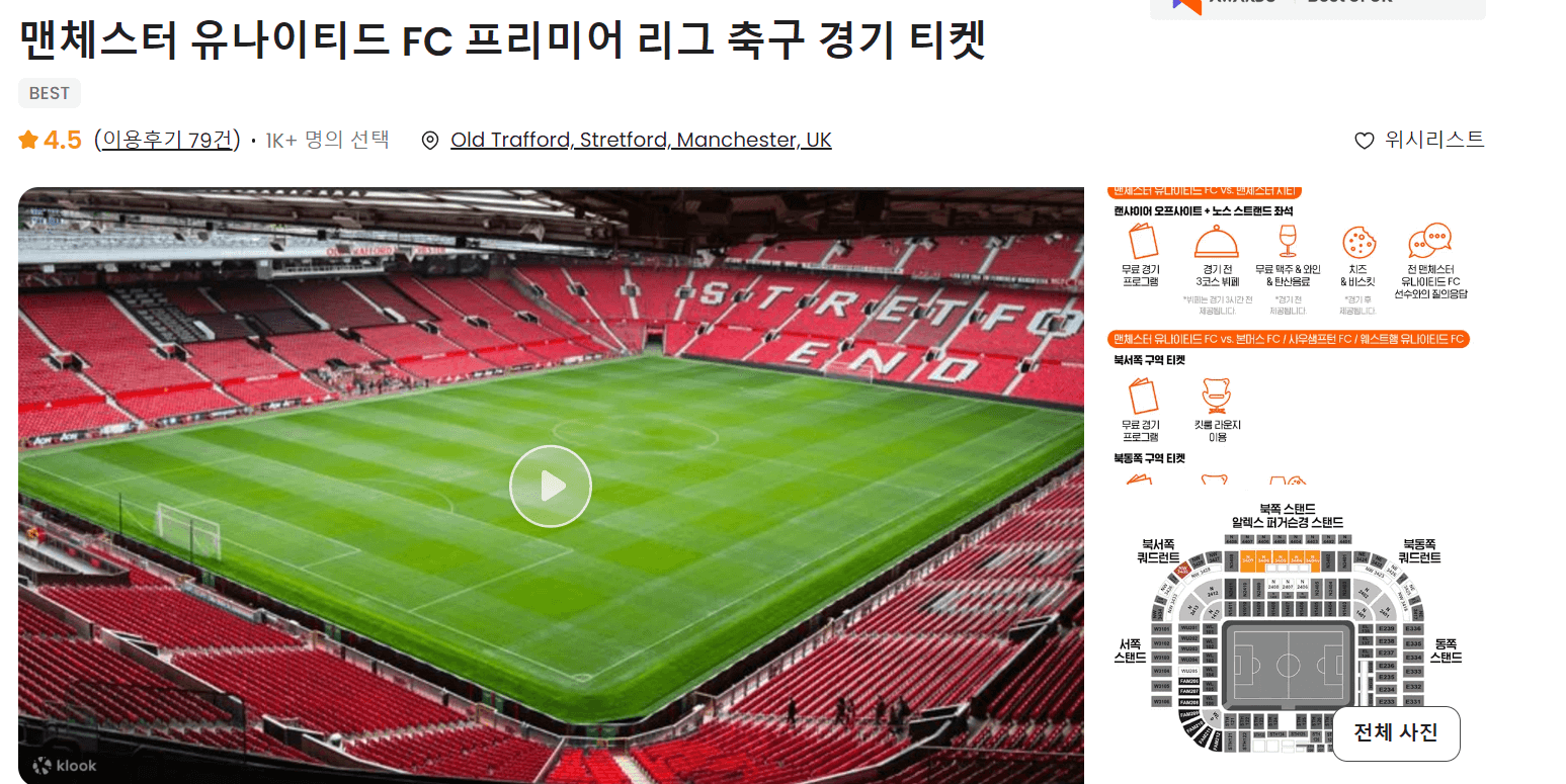 여행 / 레저 플랫폼 중 하나인 클룩(klook)에서도 프리미어리그 경기 티켓 예매가 가능합니다. 토트넘, 아스널, 리버풀, 맨체스터 시티, 멘체스터 유나이티드 등 인기 구단의 경기 관람이 가능하고 클룩에서 판매하는 티켓은 공식 티켓으로 결제와 동시에 예약이 확정됩니다. 또한 마이리얼트립 사이트처럼 최대 6인까지 연석을 배정받을 수 있다는 장점도 있습니다.