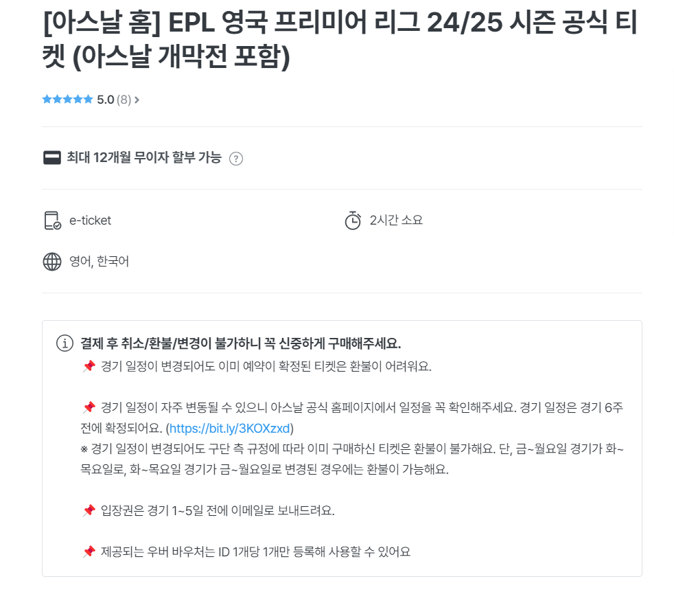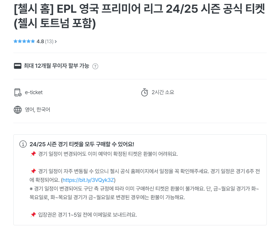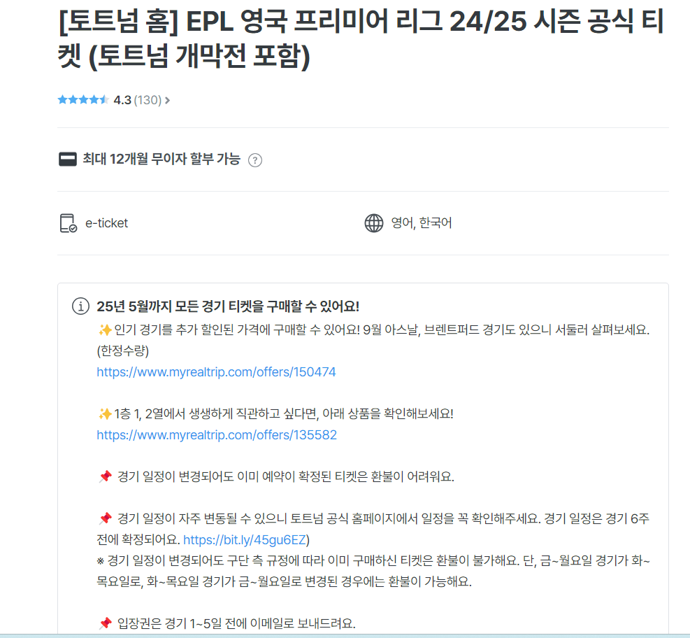 마이리얼트립 사이트에서 EPL 인기 구단의 공식 티켓을 예매할 수 있습니다. 위에서 설명드린 각 구단별 홈페이지는 여행자들이 예매하기는 힘든 경우가 많습니다. 하지만 마이리얼트립은 인기 구단 홈 경기의 공식 경기 티켓을 예매할 수 있고 연석 예매 가능, 2일 내 예약이 확정 가능하다는 장점이 있습니다.