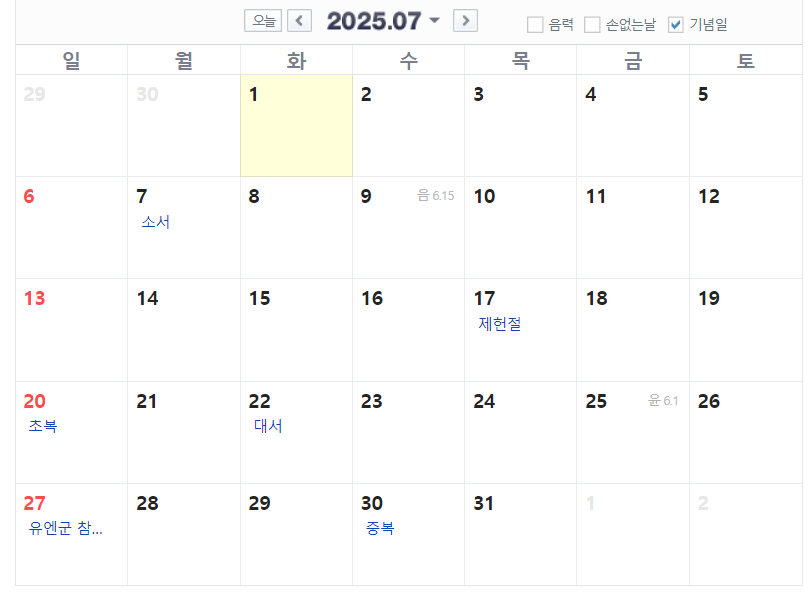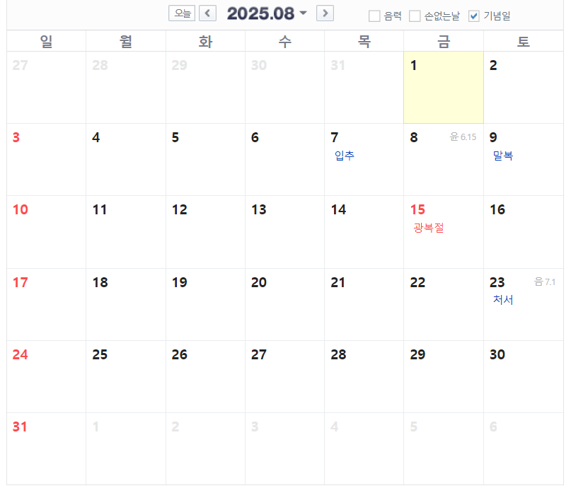 7월 ~ 9월까지는 빨간날이 8월 15일 광복절 하루입니다. 대신 광복절이 금요일이기 때문에 금, 토, 일 3일 연달아 쉴 수 있습니다.