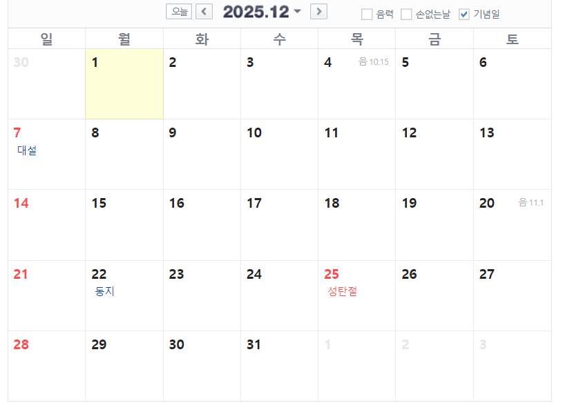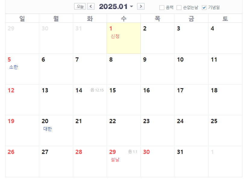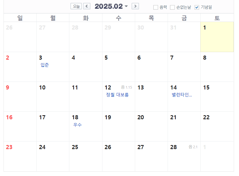 1월은 신정과 설 연휴, 3월은 삼일절이 있습니다. 2025년 2월은 28일까지이고 아쉽게도 연휴는 따로 없습니다. 25년 삼일절은 토요일이기 때문에 3월 3일 월요일이 대체공휴일로 지정되었습니다.