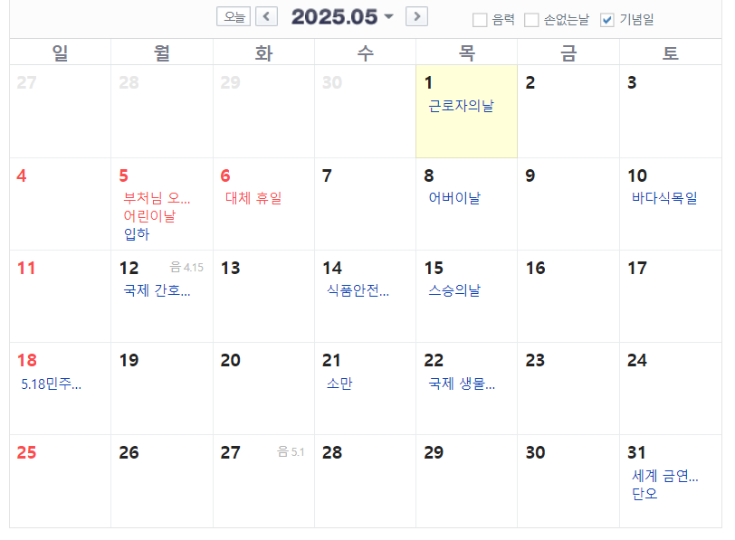 4월은 아쉽게도 쉬는날은 없고 5월은 근로자의 날, 어린이날, 부처님 오신날이 있습니다. 2025년은 어린이날과 부처님 오신날이 같은 날이여서 5/6일이 대체공휴일로 지정되었습니다. 6월은 현충일이 있습니다.