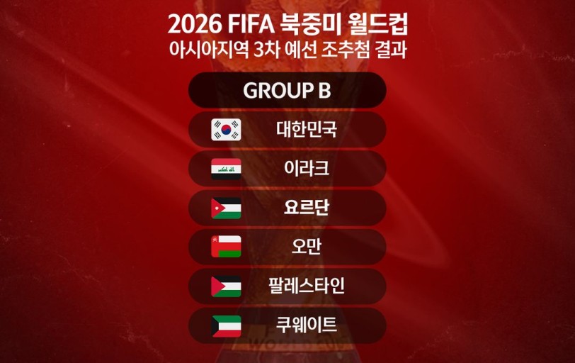한국 시간으로 6월 27일 2026 북중미 월드컵 아시아지역 3차 예선 조추첨이 있었습니다. 한국은 B조에 속하게 되었고 같은 B조인 이라크, 요르단, 오만, 팔레스타인, 쿠웨이트와 경기를 진행할 예정입니다.